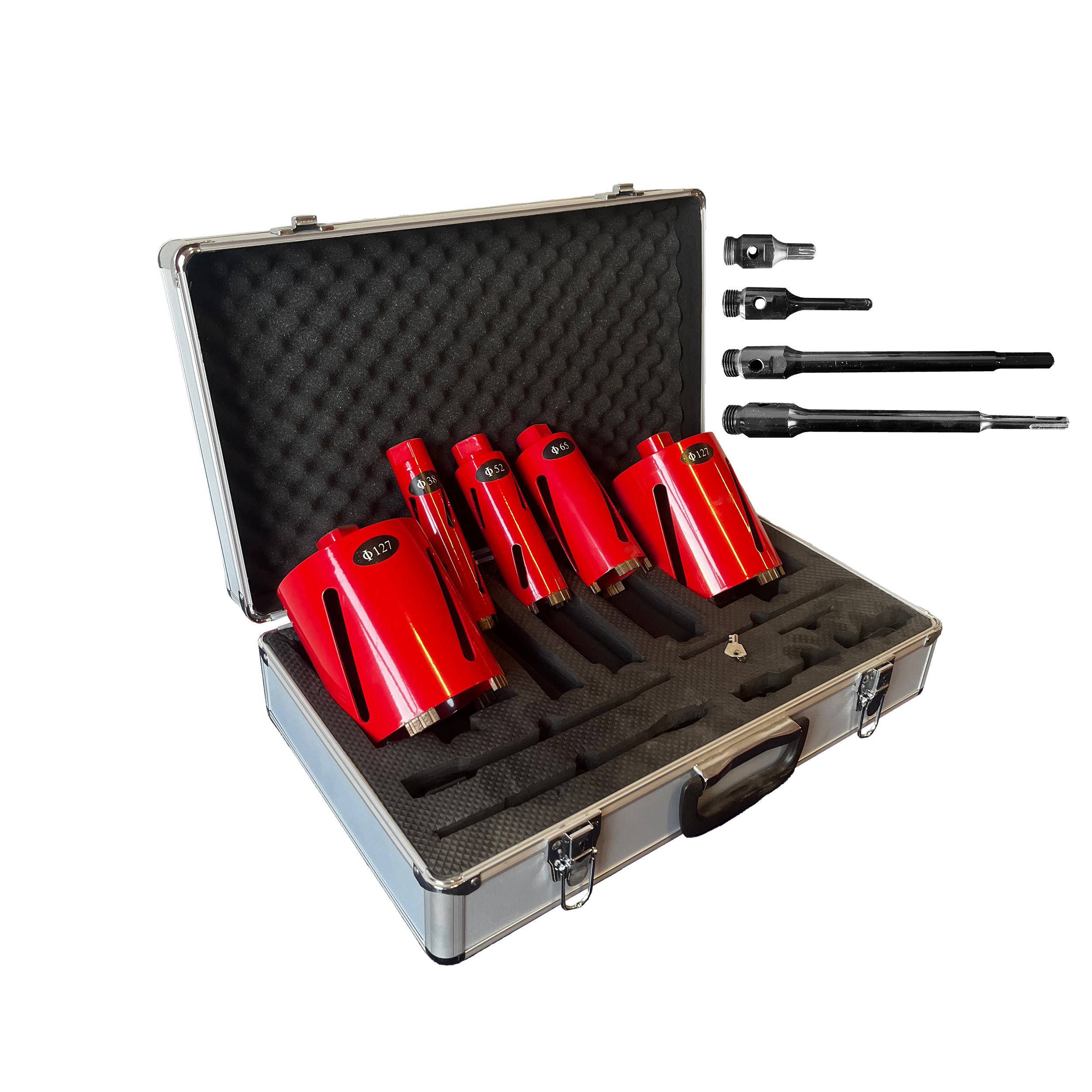 პერფორატორზე სამაგრი ბეტონის ბურღი წარმოდგენილია სხვადასხვა დიამეტრის (38; 52; 65; 127 მმ) მრავალფეროვანი არჩევანით, რაც ბეტონის, აგურისა და ქვის ზედაპირების უზადო დამუშავების გარანტიაა. თითოეული კომპონენტი დამზადებულია ინოვაციური ვაკუუმური შედუღების ტექნოლოგიით, რაც განაპირობებს მათ განსაკუთრებულ გამძლეობას, მაღალი ტემპერატურისადმი მდგრადობასა და ხანგრძლივ საექსპლუატაციო ვადას. აღნიშნული კედლის გვირგვინი შექმნილია მათთვის, ვინც აფასებს მუშაობის სისწრაფესა და პრემიუმ ხარისხს. ნაკრები მოთავსებულია პრაქტიკულ და დაცულ ქეისში, რაც მაქსიმალურად ამარტივებს მის ტრანსპორტირებასა და შენახვას. კომპლექტაციაში არსებული დამხმარე გადამყვანები კიდევ უფრო ზრდის აპარატის ფუნქციონალურობას, ხოლო ხარისხიანი პერფორატორზე სამაგრი ბეტონის ბურღი უზრუნველყოფს სამუშაო პროცესის ეფექტურობას ნებისმიერ სირთულის გარემოში.